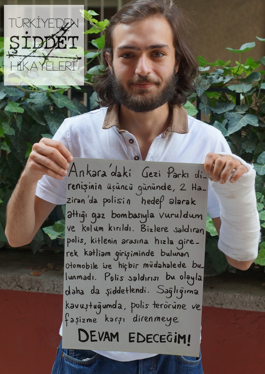 Polislerle aramızda yaklaşık 30 metre vardı. İçlerinden biri gaz bombası silahını üzerimize nişan alıp tetiğe bastı. Önümdeki arkadaşım hızlı bir refleks sonucu çekildi. Ben de üzerime gelen gaz bombasını fark edince gayriihtiyari kolumu göğsüme doğru kaldırdım ve kolumdan vuruldum. Yaralandığım için meydandan ayrıldım ve o hengâmede bir şekilde Necatibey Caddesi’ne gidebilmeyi başardım. Önce evime, oradan da hastaneye gittim.