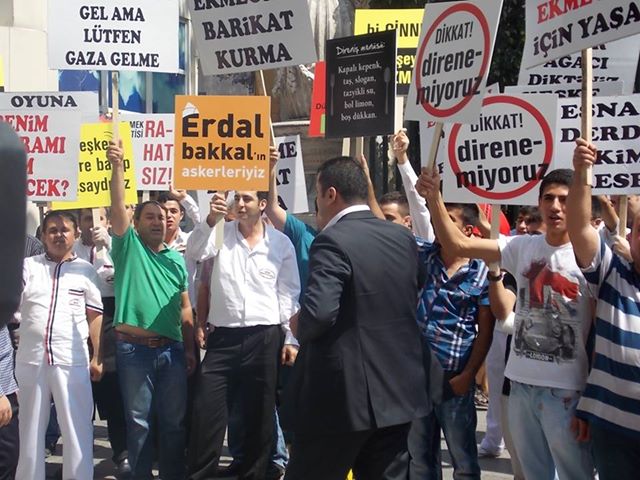 Galatasaray Meydanı’nda bir araya gelen bir grup Beyoğlu esnafı, ellerinde “Gezi dediniz, ekmeğimizden ettiniz”, “Taksim herkesindir”, “Esnafın ahını tek geçerim”, “Oyuna gelme ekmeğin için yaşa” yazılı dövizler taşıyarak, çeşitli sloganlar attı.