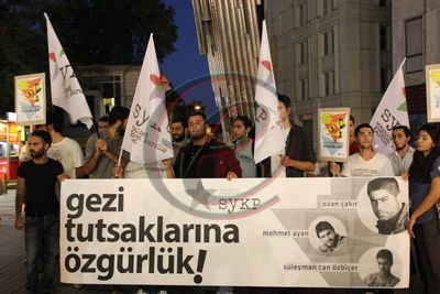 “Gezi tutsaklarına özgürlük” pankartının açıldığı eylemde tutuklu SYKP üyelerinin fotoğraflarının bulunduğu dövizler taşındı.