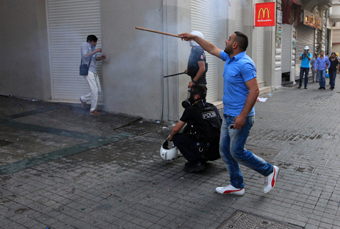 Daha sonra elinde sopayla gösterici avındaki bu kişi bir arkadaşını arayarak yanına gelmesini istedi. Gelmediği için de arkadaşına küfürler savurdu. Sonra polislerin ikazıyla olayları uzaktan da olsa takip etmeyi sürdürdüm. Uzun süre bu mavi gömlekli kişinin peşinden gittim. İstiklal Caddesi’nde koşan başka bir çevik kuvvet polisinin peşinden o da koştu. Bir dükkana sığınan göstericilere hücum etti. Ancak esnaf kepenkleri kapatmıştı. Mavi gömlekli kişi de kepenklere onlarca kez sopayla vurdu. Eli sopalı adam daha sonra yine başka bir polis grubunun peşinden atağa kalktı. Ancak bu kez bir polis amiri bu kişinin elindeki sopayı almaya çalıştı. Önce sopayı vermek istemedi ve polise kendince haklı gerekçesini açıkladı: “Ben sizdenim…” Polis amiri bunun üzerine “Sizdeni bizdeni yok” diyerek sopayı zorla bu saldırganın elinden aldı.